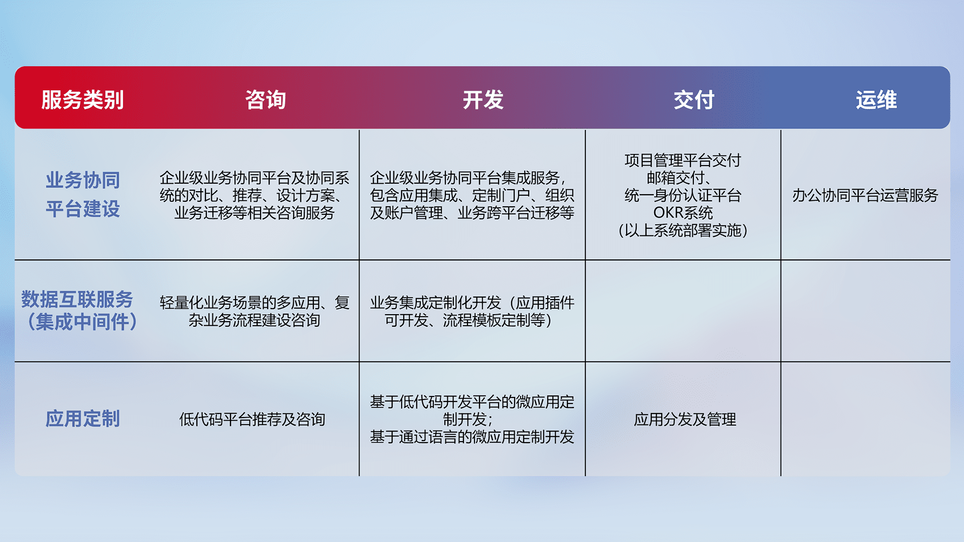针对钉钉、、、、企微、、、IDaas等平台级产品提供产品的规划、、、方案、、交付、、、定制化开发等服务,,,实现如统一协同办公、、、、智能客户服务、、混合会议管理、、、、智能数据查询、、、等业务场景,,,实现数字化转型。。