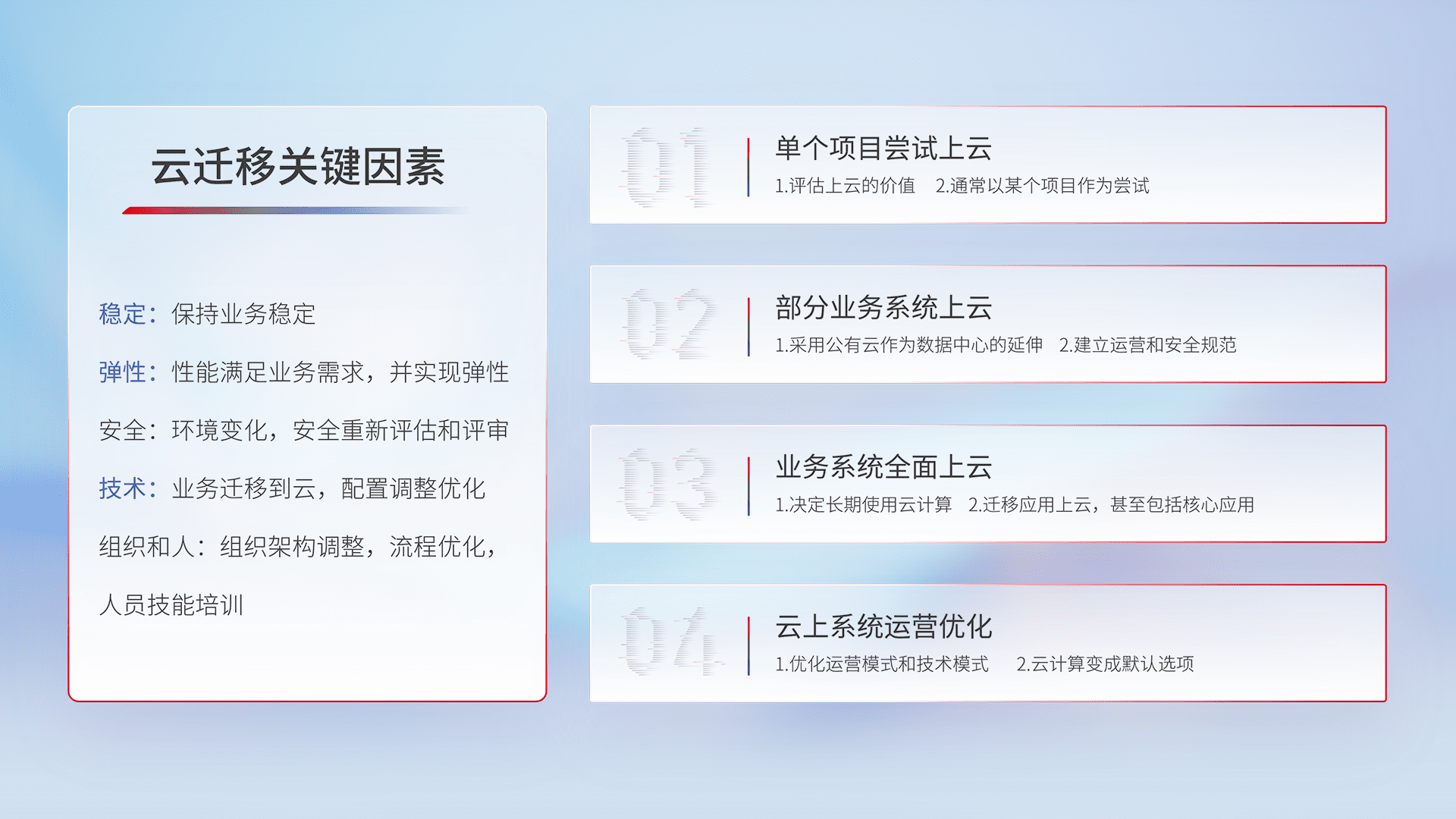 结合实际业务,,从规划设计、、云平台选型、、、云原生改造、、、、数据迁移、、集成交付,,迁移全过程为客户识别最佳上云路径,,,,做好风险识别管理,,设计网络架构、、身份权限、、、、安全审计合规、、、、操作审计、、日志审计、、监控告警策略、、多站点容灾设计等,,,,对云上基础设施进行整体规划,,,,提升IT治理水平,,,以满足弹性、、、高可用、、高性能的需求。。