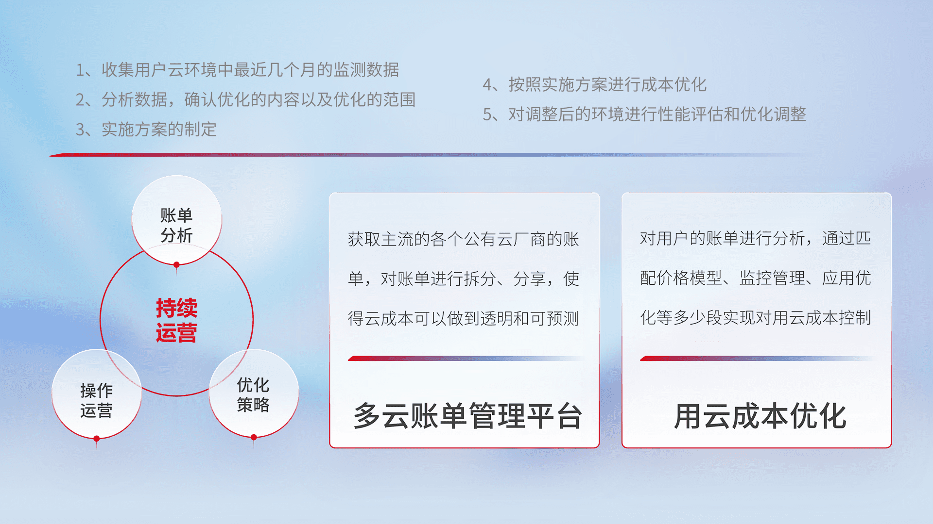 通过多云纳管,,以统一的资源数据模型把客户的云资源进行抽象和封装,,,,进而实现对多云资源的统一操作,,保障云资源管理的可靠性、、稳定性与可用性。。。量身定制化运维内容,,,配置、、、开发运维、、、补丁管理、、、、备份、、监控、、、、认证和访问管理、、、、审计和日常巡检等,,,,保障在用云过程中的可靠度,,,稳定度以及高可用率。。。