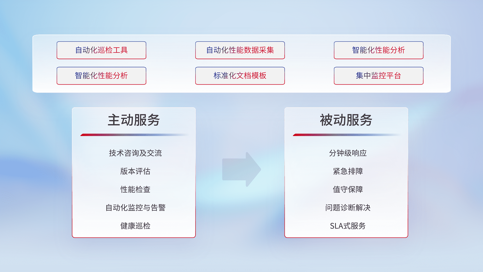 智能化工具和标准化文档,,,保障服务质量,,,,提供主动服务(包含技术咨询、、、、版本评估、、性能检查、、、自动化监控与告警、、健康巡检)和被动服务包含(分钟级响应、、、、紧急排障、、、值守保障、、、问题诊断解决、、SLA服务)。。